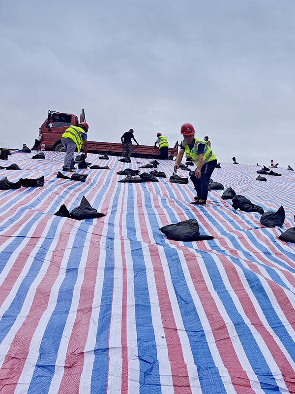 鋪設苫蓋彩條布 防止雨水浸泡渠道邊坡
